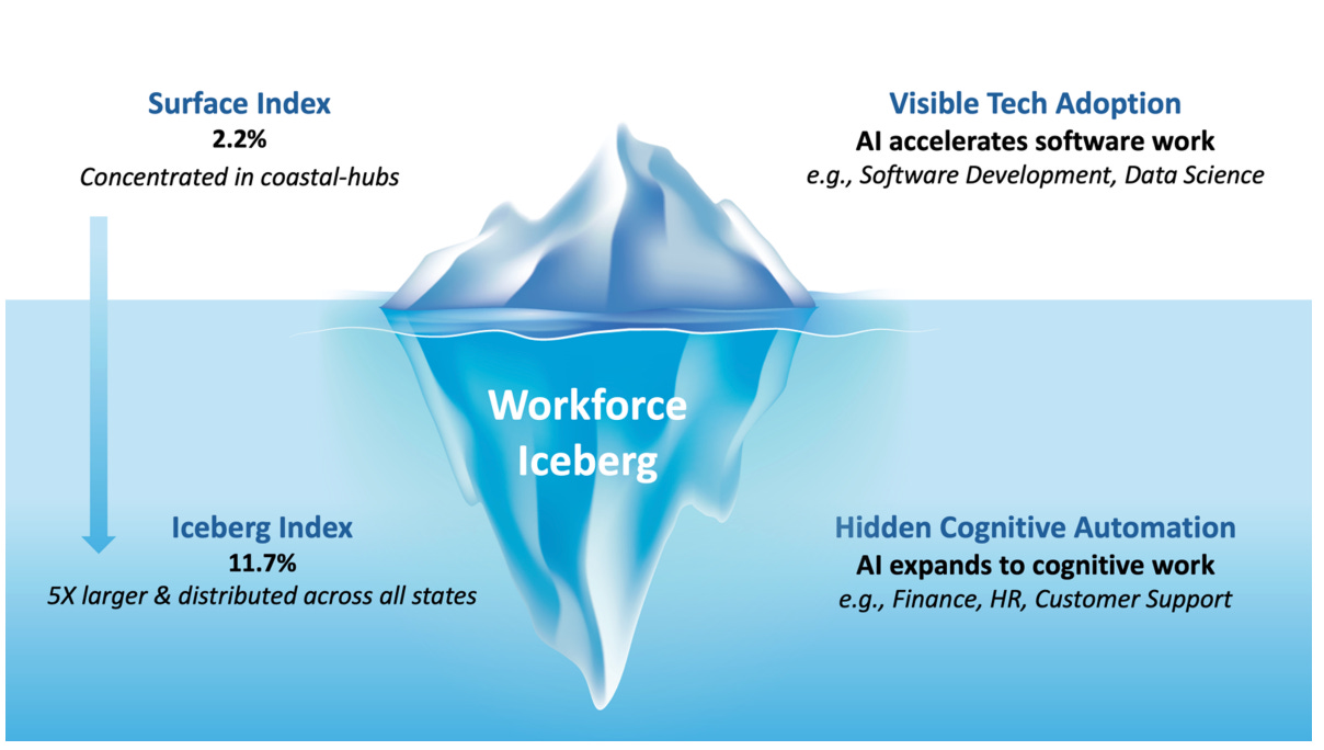 MITâs new Iceberg Index offers one of the clearest pictures yet of how exposed todayâs workforce is to AI - and the findings are sharper than many expected. By creating a âdigital twinâ of 151 million U.S. workers and matching 32,000 skills against thousands of AI tools, researchers found that while only 2.2% of visible work has been automated so far, nearly 11.7% of total wage value, about $1.2 trillion, is already technically within AIâs reach.